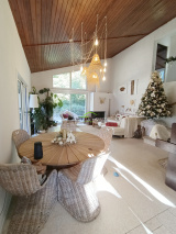 La maison dispose d'une entrée, une cuisine ouverte, un salon/salle à manger avec cheminée ouvrant sur deux terrasses, un espace bureau, quatre chambres dont une en sous-sol, une salle de douche, une salle de bains.