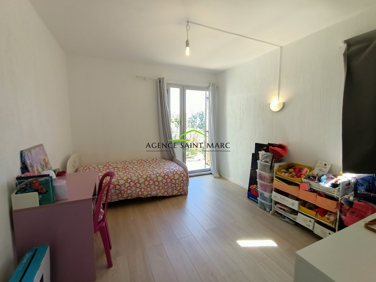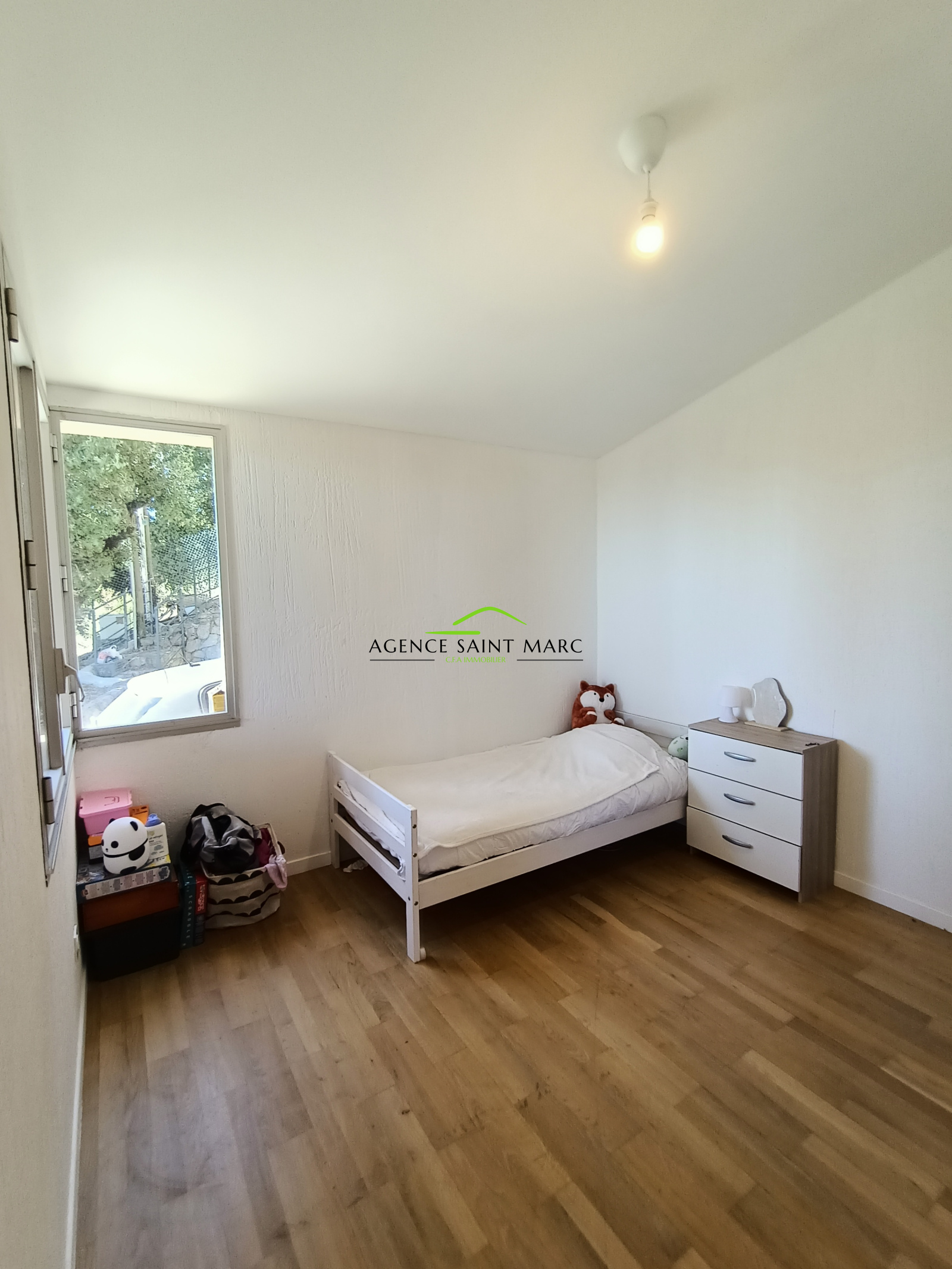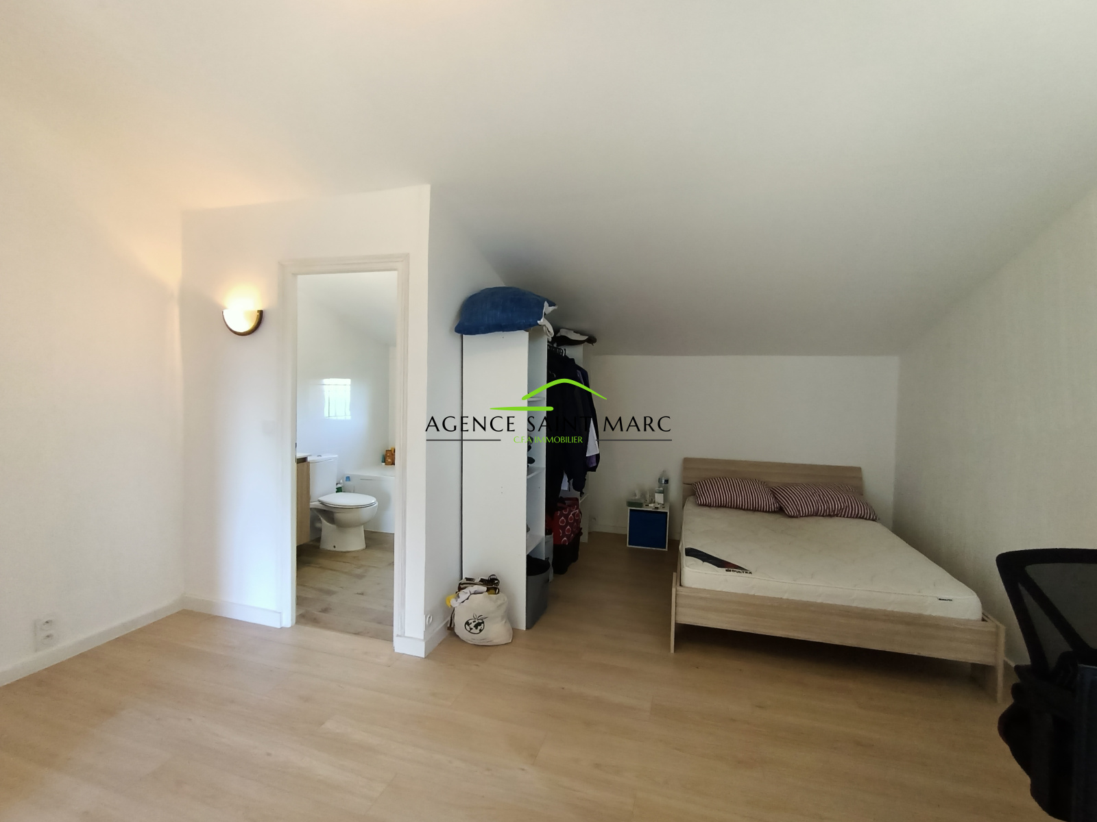 A l'étage, une grande chambre avec sa terrasse privative et une salle de bains.